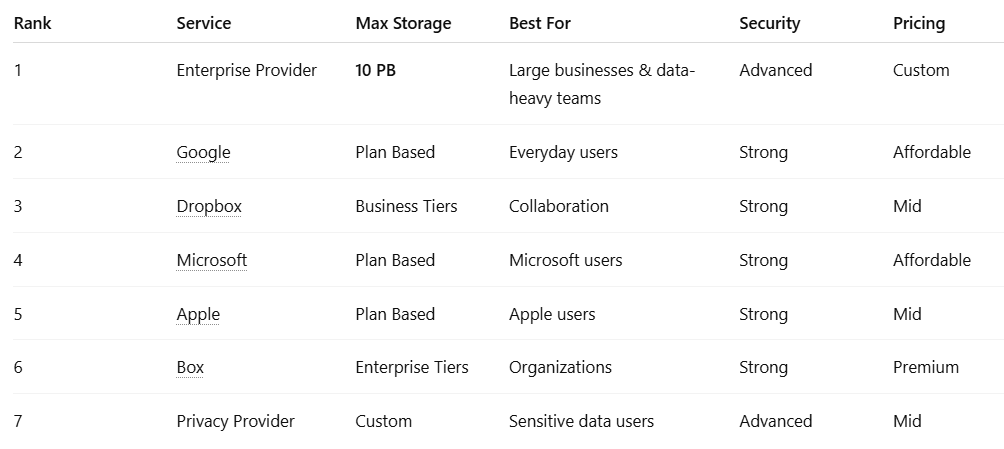 For individuals, the priority may be affordability and easy syncing. For businesses, it is often collaboration, compliance, uptime, and long-term scalability. Many providers look similar at first glance, but the differences become clear when you compare pricing limits, sharing tools, support quality, and storage capacity.